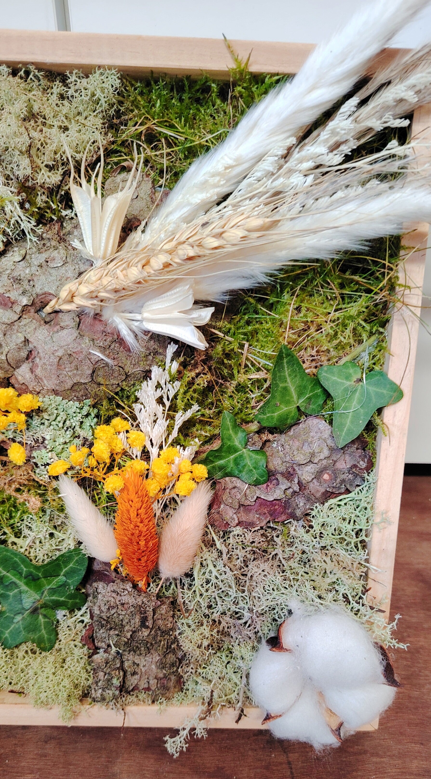 Cadre végétal composé de différentes miysses, lichens, écorces , gypsophiles et pampas et fleur de coton.